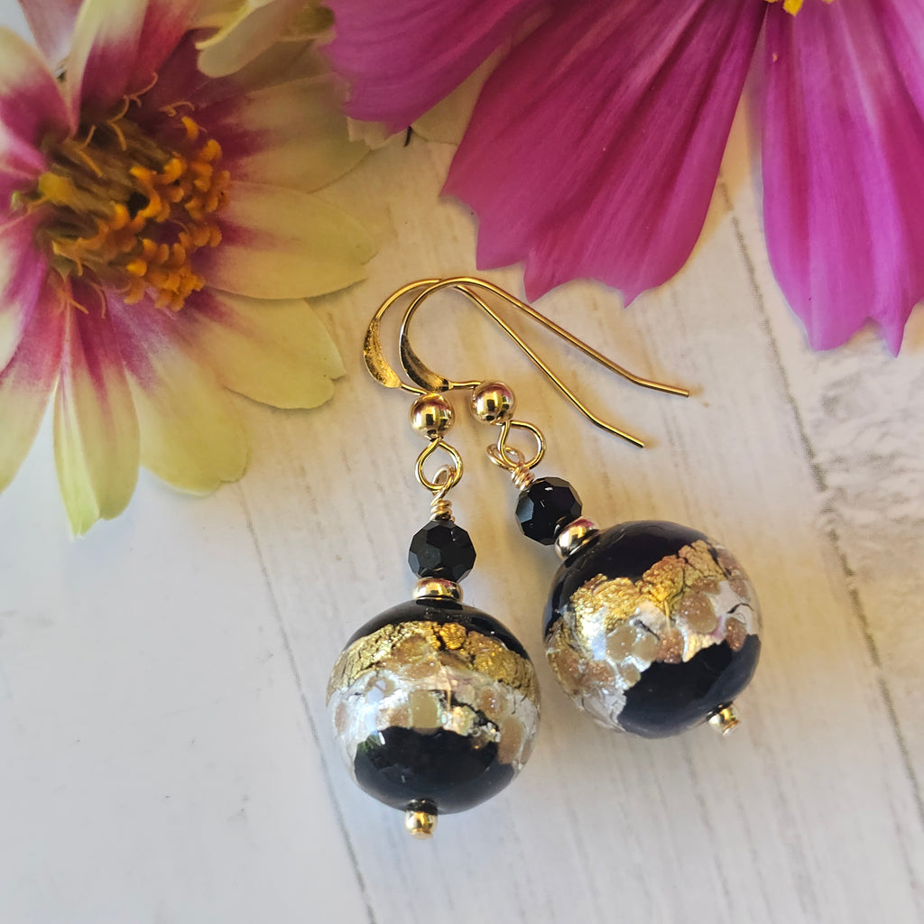 Lovely pair of earrings showcasing Murano Glass 12mm round bead in black base with a band of 24kt gold foil and .925 sterling silver, with splashes of aventurina (bronze sparkle). The smooth round beads, pins and ear-wires are 14kt gold-filled. These stunning earrings measure approximately 44mm from the top of the ear-wire to the base of the earring.
