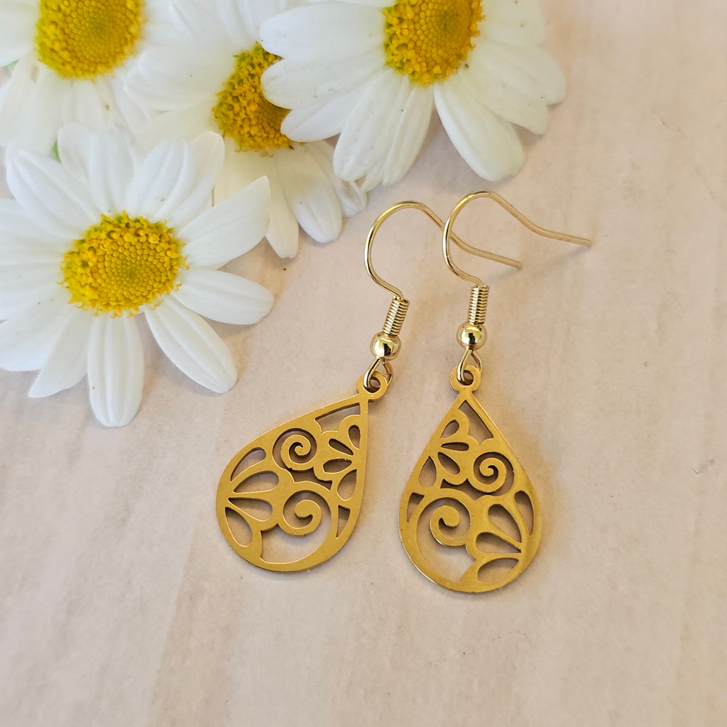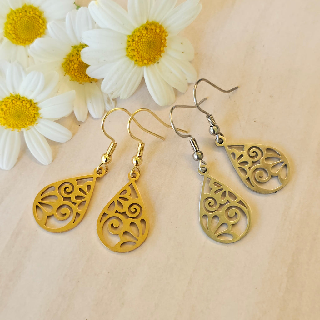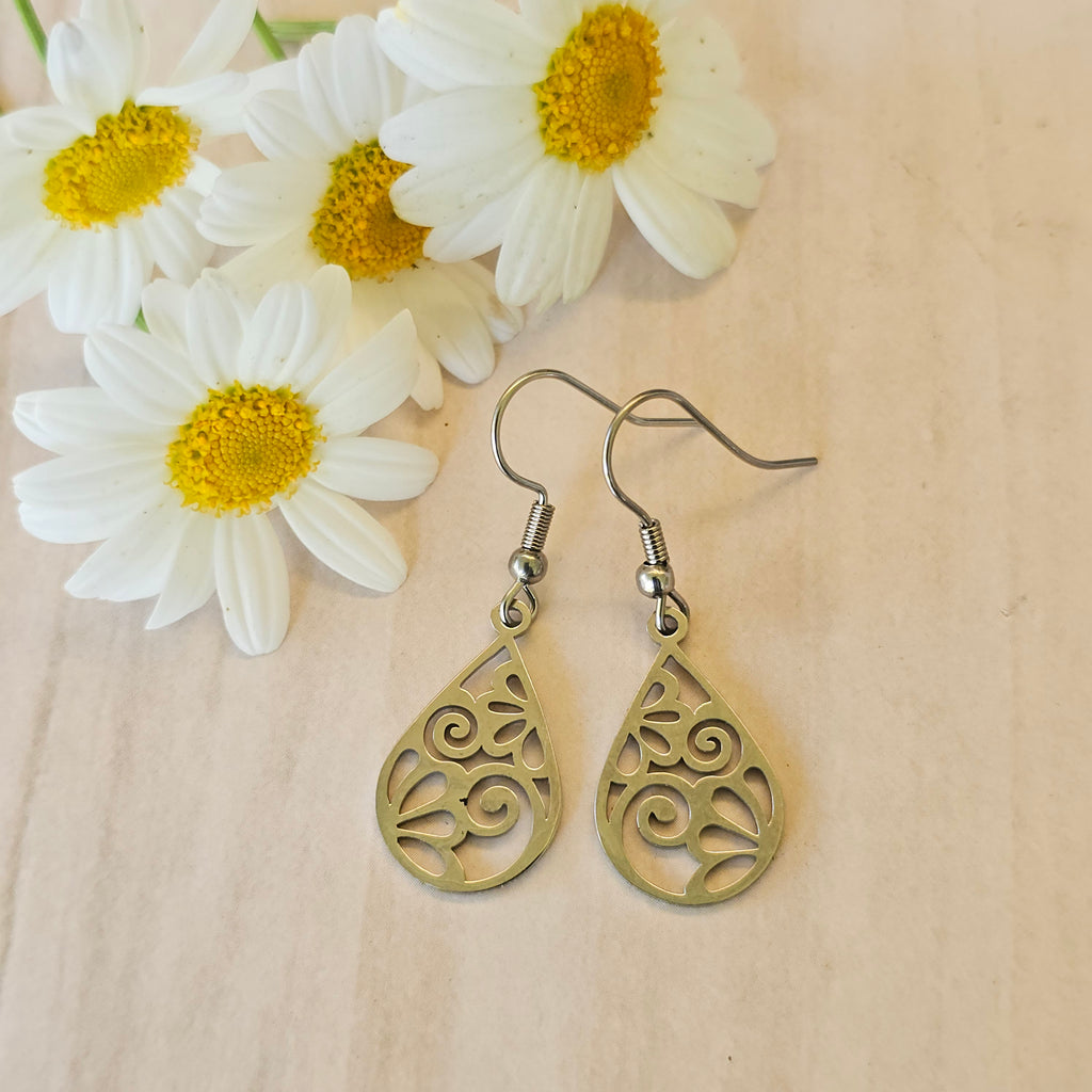 Beautiful, simple, lightweight teardrop-shaped stainless steel earrings which have been laser cut with a lovely flower pattern. Surgical stainless steel ear-wires. The earrings measure approximately 40mm from top of ear-wire to base of earring.