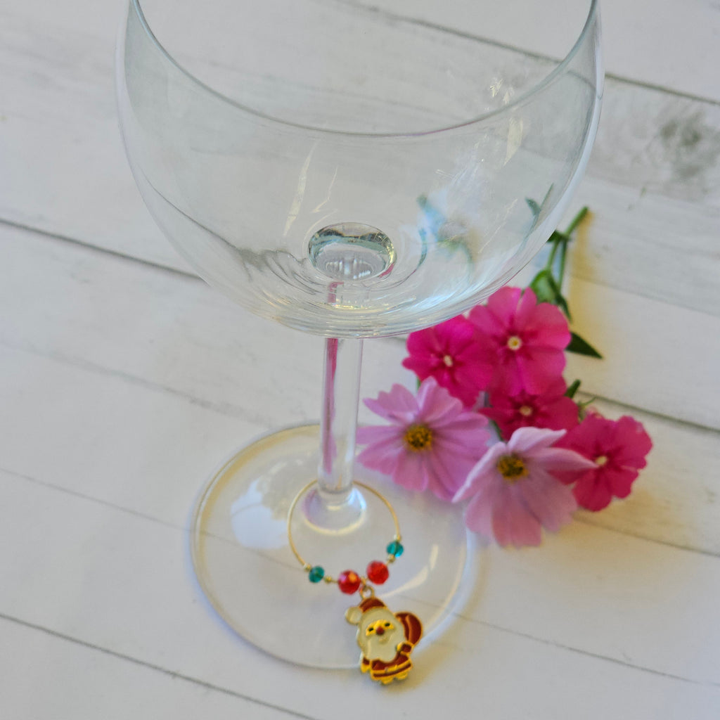 Is that your wine or mine? Now you and your guests will know whose is whose with these cute Christmas-themed wine charms to fit around the stem of your yraditional wine glass. Made with round 18kt gold-plated stainless steel rings decorated with glass faceted rondelle beads in red and green, gold glass seed beads and gold-coloured enamel charms.