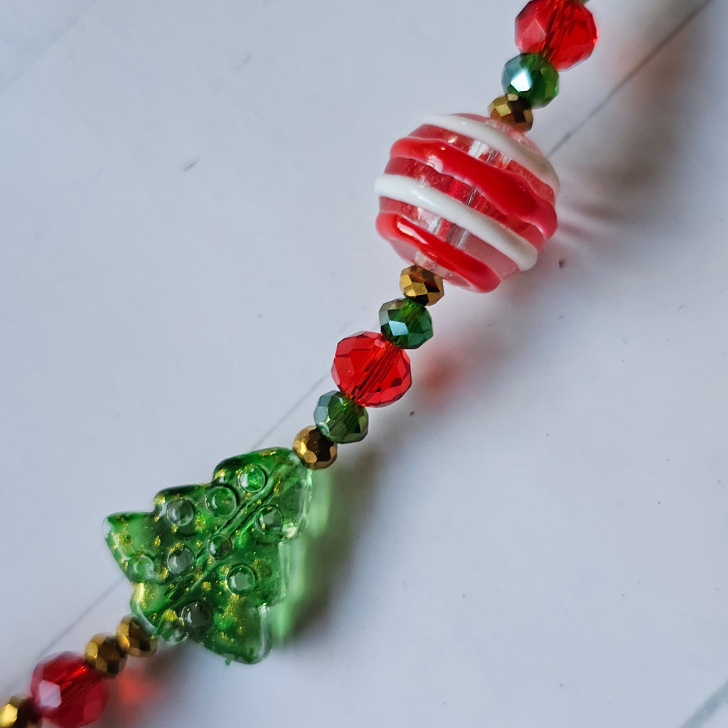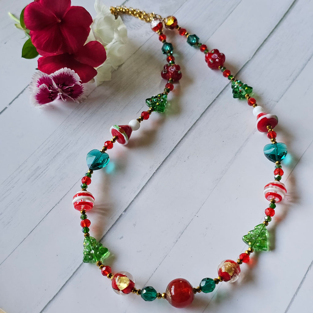 This festive necklace in shades of green and red has Christmas written all over it, and I have made it with a selection of pretty glass beads interspersed with faceted dark gold glass beads. Finished with a small length of gold-plated belcher chain at each end with a gold-plated stainless steel 12mm toggle clasp, the necklace measures approximately 64cm in length.