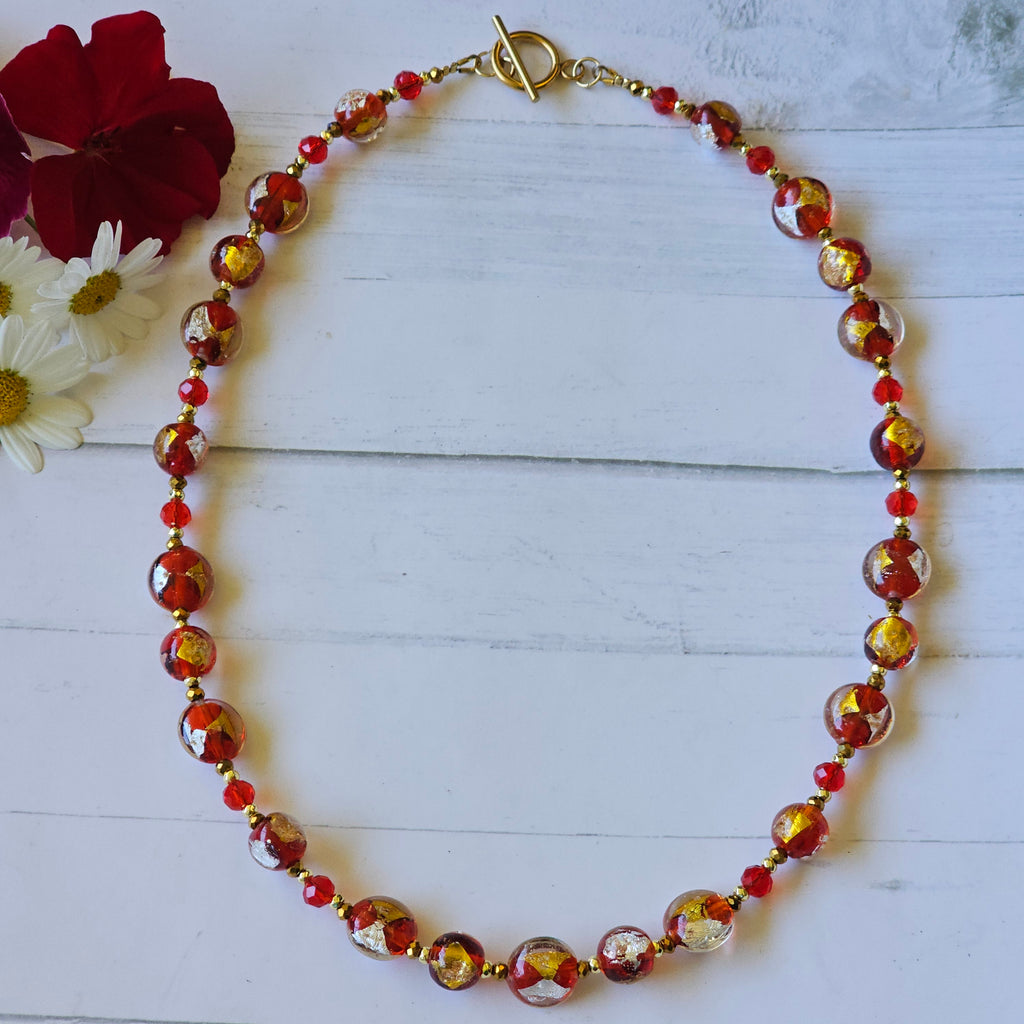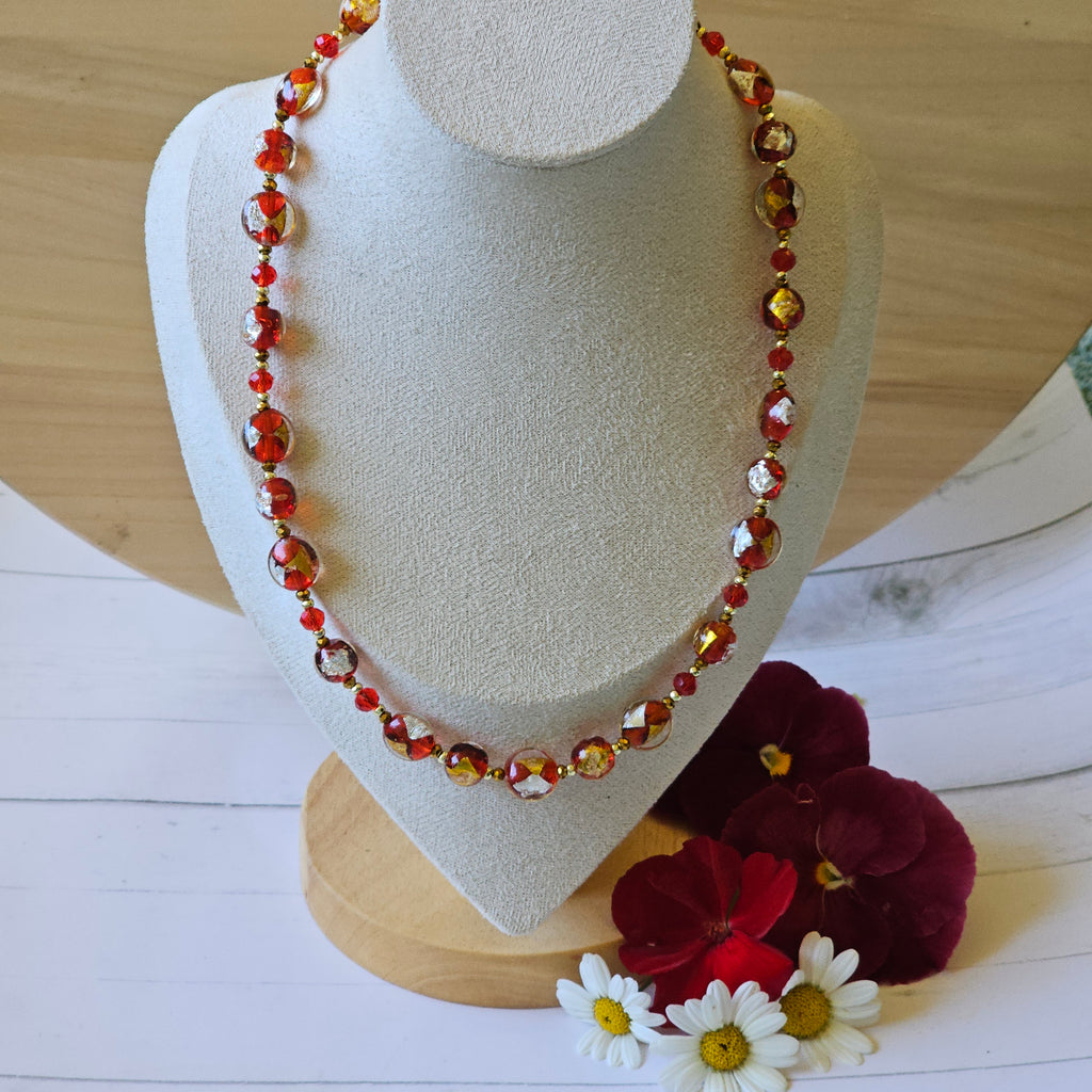 You could wear this lovely necklace whether you prefer gold over silver, or the other way around as both are catered for.  The feature beads are a disc shape with a pattern of bright red and both silver and gold foil encased in clear glass and 12mm round glass beads in a similar style.  The complementary beads are 6mm red faceted glass rondelles, small 18kt gold-plated stainless steel beads, and tiny dark gold electroplated faceted beads.  The necklace measures approximately 50cm in length and has a gold-coloured stainless steel toggle clasp.