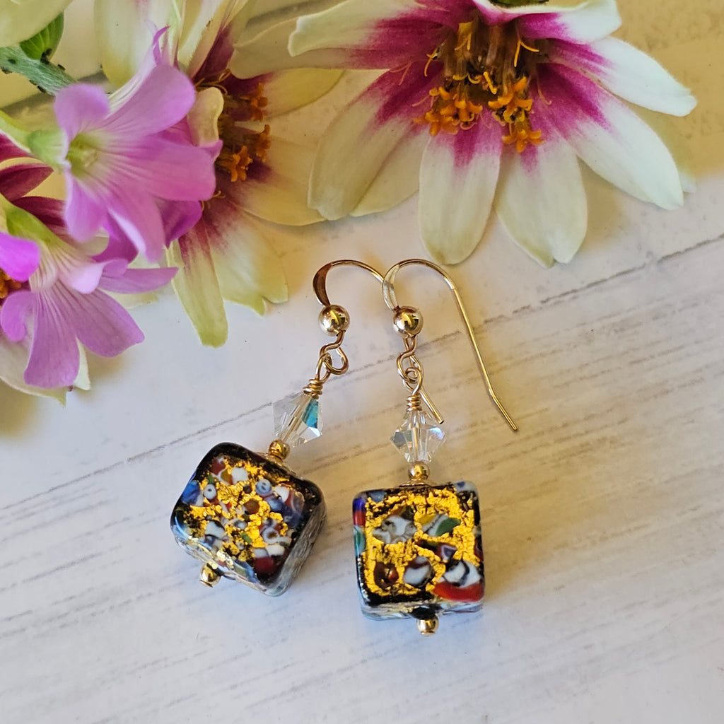 These eye-catching earrings will add a touch of sparkle to any outfit. Made with 10mm Murano glass cube beads in a variation of the Klimt style, with small pieces of millefiore glass inside over 24kt gold foil. Teamed with top-quality clear AB crystal bicone and 14kt gold-filled smooth round and rondelle beads, pins and ear-wires. Earrings measure approximately 40mm from the top of ear-wire to base of earring.