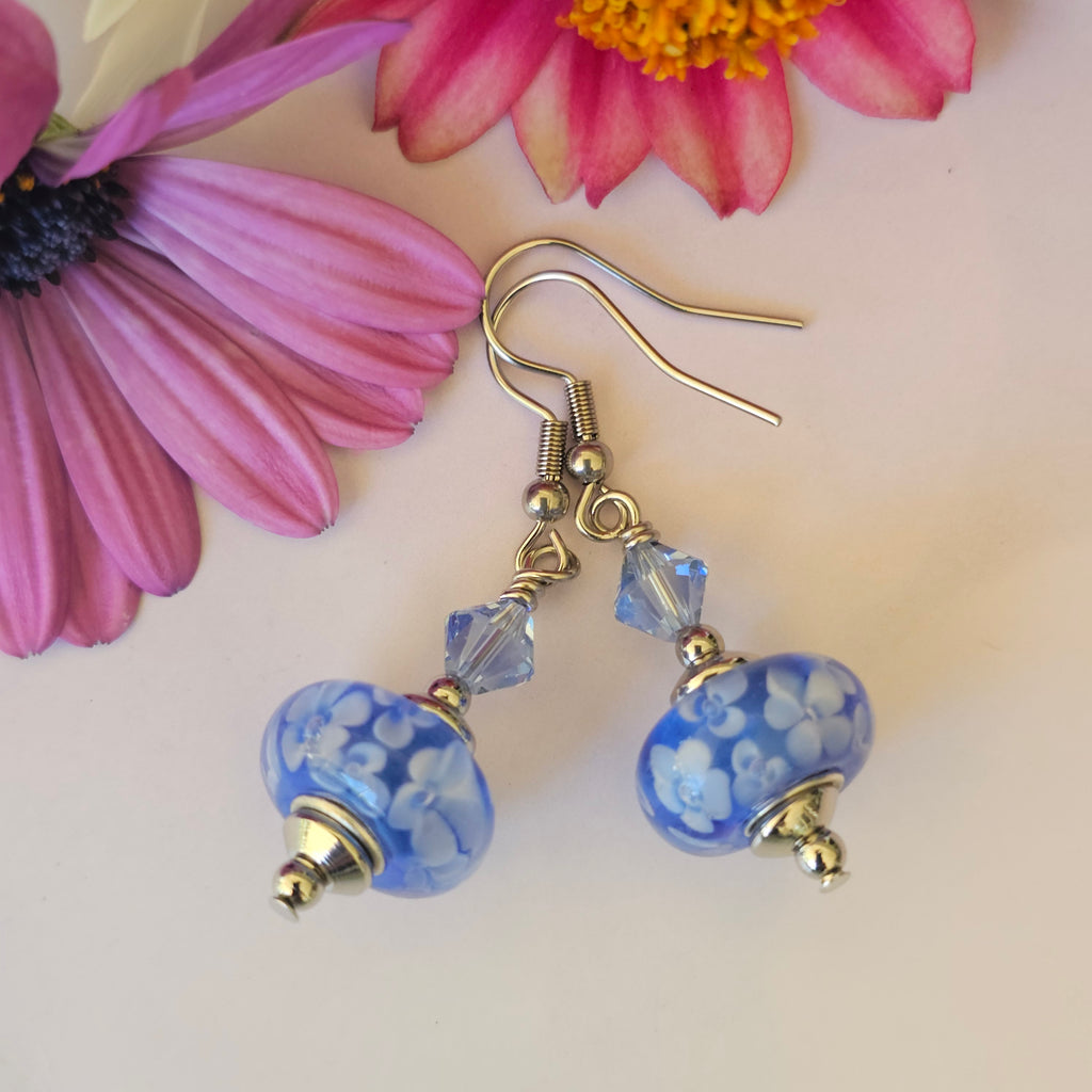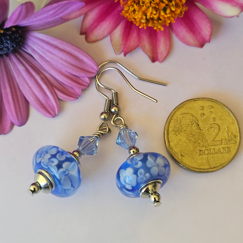 Pretty 12mm round lampwork glass beads feature in these lovely earrings complemented with top-quality crystal bicones. Base metal beads, pins and surgical stainless steel ear-wires. Earrings measure approximately 45mm from the top of ear-wire to base of earring.