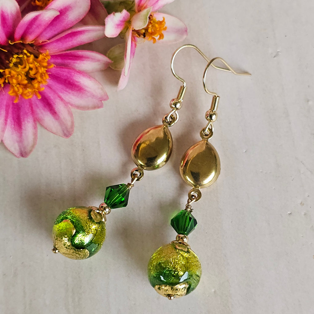 Gorgeous Murano glass dangle earrings comprising round 12mm beads with 18kt gold-plated stainless steel earwires, pins, beads and diamond-shaped or teardrop shaped connector. The length of the earrings from the top of the ear-wire to the base of the earring is approximately 60mm.