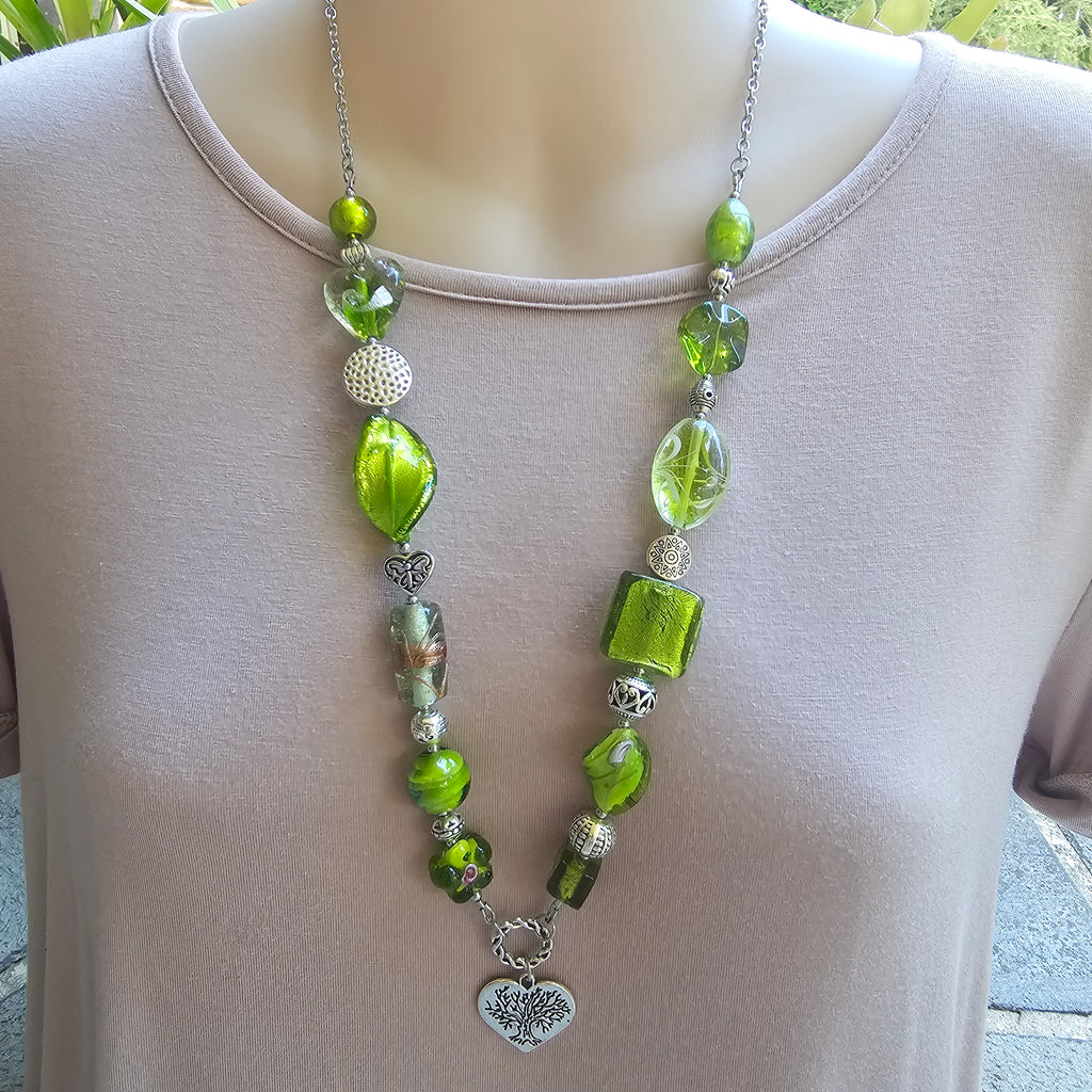 This eye-catching necklace is a one-off design made up of a mixture of beautiful beads including a gorgeous silver foil Murano glass twist bead measuring 30mm x 20mm, plain glass beads, silver foil glass beads and lampwork beads in shades of green, interspersed with base metal silver accent beads. Finished with a length of stainless steel chain allows the necklace to go straight over the head without the need for a clasp. The base metal silver heart charm measures approximately 25 x 26mm. The ring the tree charm hangs from is approximately 12mm in diameter. Total length of necklace is 71cm excluding the charm and ring which together measure approximately 4cm in length.