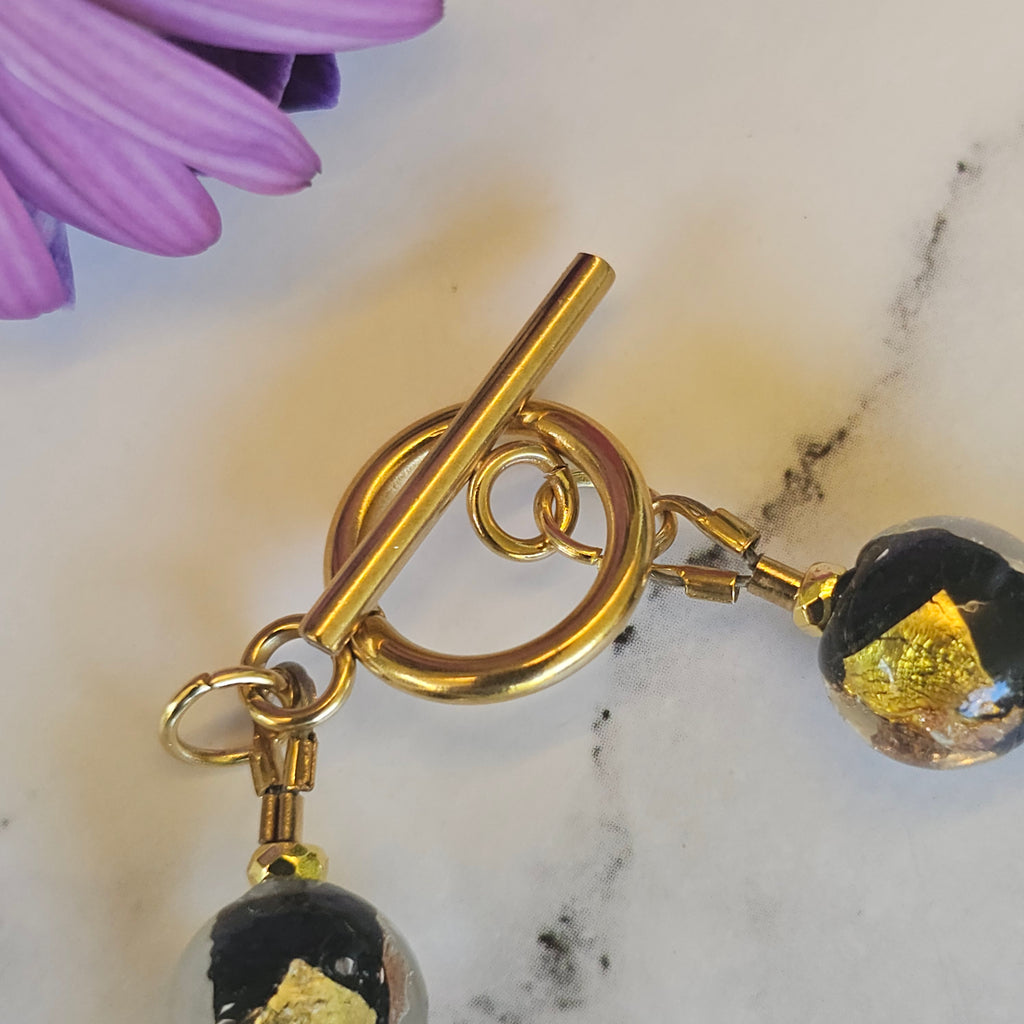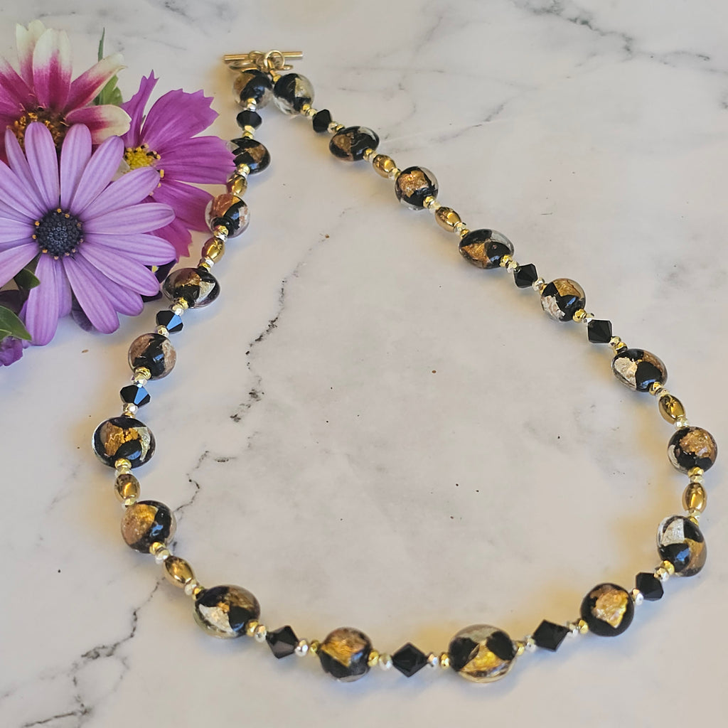 Glamorous necklace featuring beautiful glass beads in two styles, with a black core and splashes of gold and silver foil with bronze sparkle, measuring approximately 8mm round and 12mm disc shaped. Teamed with small round black faceted glass beads, tiny electroplated silver and gold faceted beads, and 18kt gold-plated oval beads with a star pattern etched on them. The necklace features an 18kt gold-plated stainless steel 12mm toggle clasp and the length of the necklace is approximately 50.5cm.