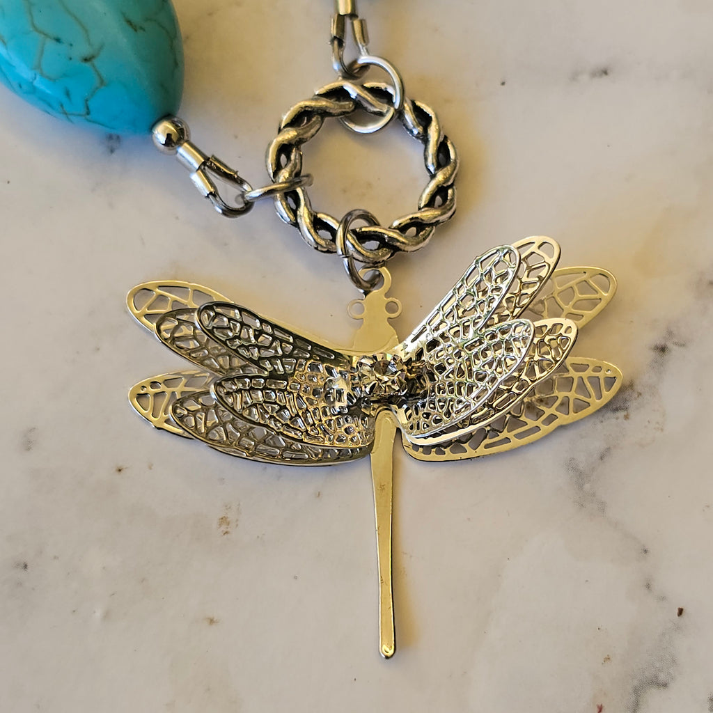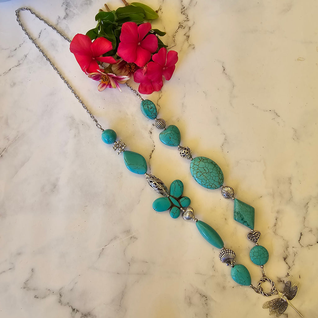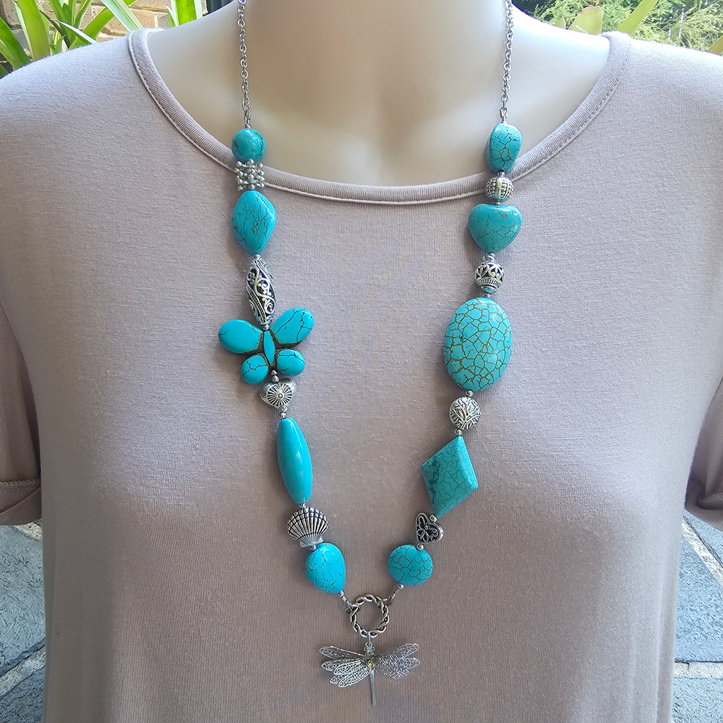 This eye-catching necklace features an assortment of dyed howlite beads in lovely shades of turquoise interspersed with base metal silver accent beads. The stainless steel dragonfly charm measures approximately 30 x 40mm. The length of the necklace is approximately 70cm including the stainless steel chain but excluding the charm and twisted ring, which together measure approximately 5cm, and is designed to go straight over the head without the need for a clasp.