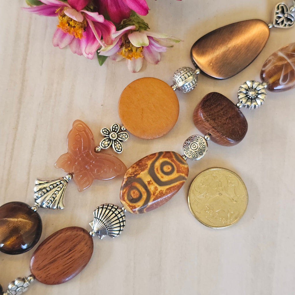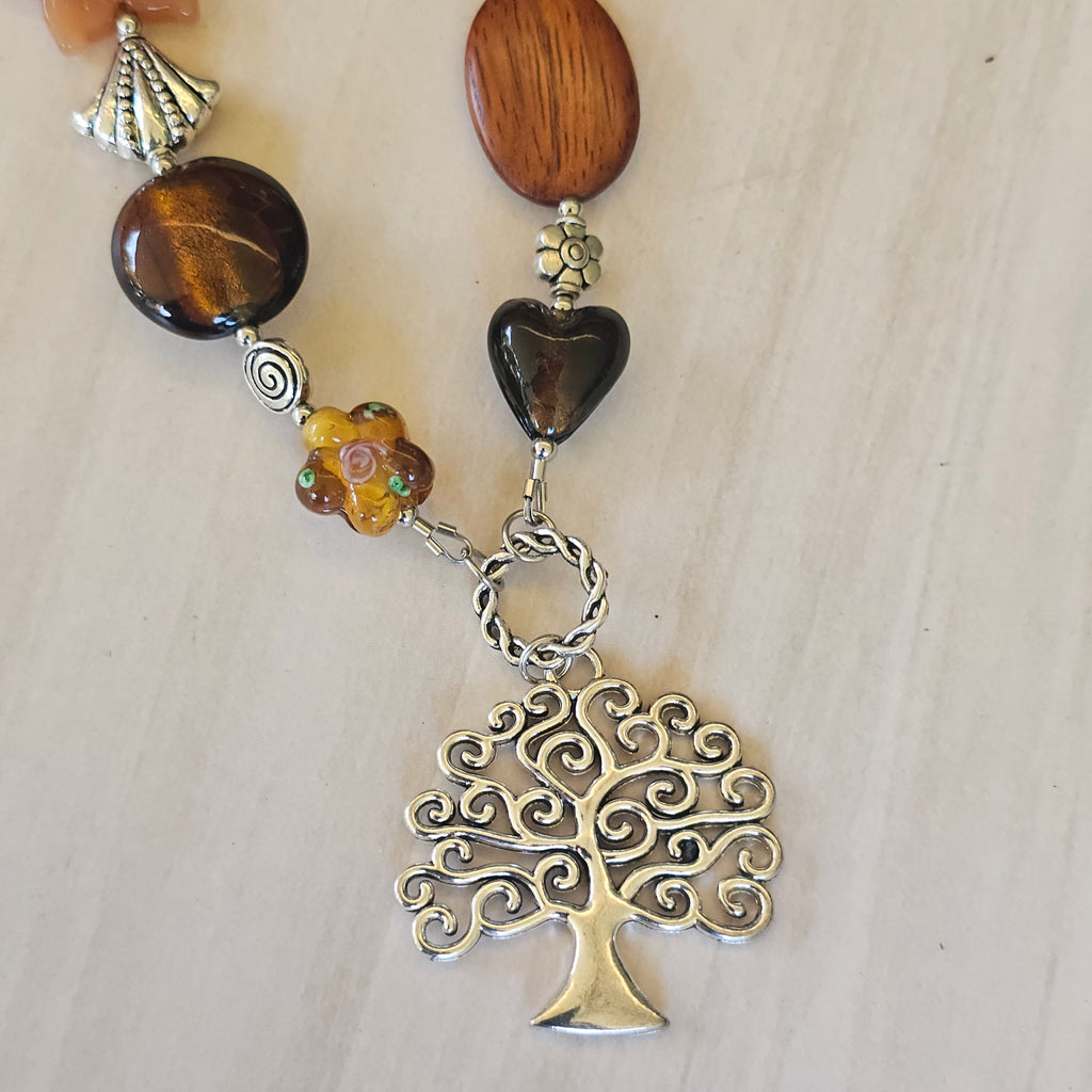 Natural earthy one-off long necklace designed to slip straight over your head with no need for a clasp. Wonderful selection of wooden, gemstone, glass and tribal beads with base metal silver accent beads. Finished with a length of stainless steel chain. The base metal antique silver twisted metal ring measures 12mm in diameter and the base metal tree charm measures approximately 40mm x 40mm, together measuring approximately 55mm. The necklace measures approximately 73cm excluding the ring and charm.