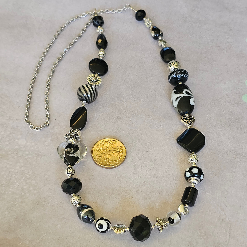 This stylish one-off black beaded necklace features a delightful assortment of plain black glass beads and black and white, or black and silver glass beads, including a Murano glass teardrop bead, with an assortment of base metal silver beads and small stainless steel beads.  It is completed with a length of stainless steel chain and measures approximately 74cm in length. The necklace is designed to go straight over the head.