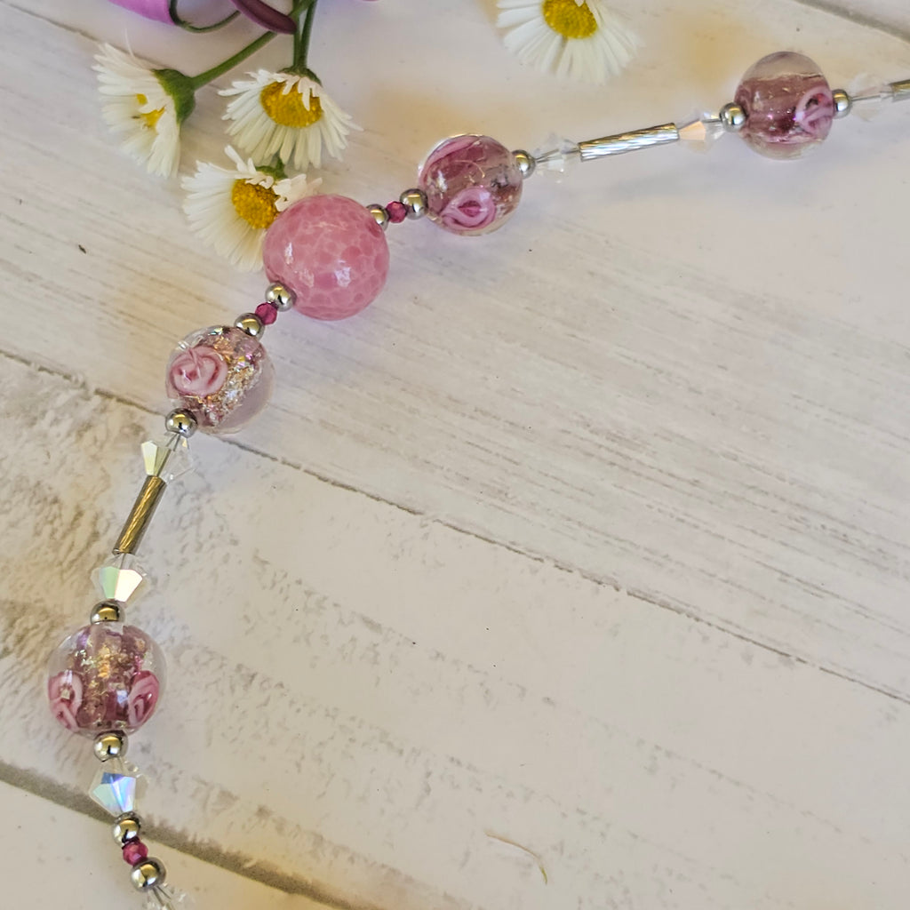 The gorgeous bead featured as the centrepiece in this pretty pink necklace is made of pink glass with specks of darker pink, and measures 45 x 15mm, with matching 12mm round beads, 8mm silver foil pink glass lampwork beads, 5mm top-quality brand-name crystal bicones, 2mm dark pink cubic zirconias, and stainless steel 8mm tube beads and tiny stainless steel filler beads. The necklace measures 51cm in length and is finished with a 12mm stainless steel toggle clasp.
