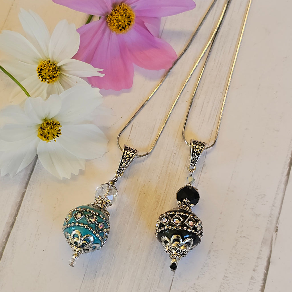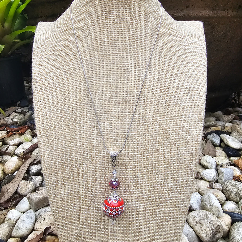 Beautiful pendant featuring handmade Indonesian Kashmiri bead measuring approximately 22mm x 24mm inlaid with crystals and teamed with faceted glass rondelle bead and top-quality brand-name crystal bicones, base-metal beadcaps and beads, suspended on a 46cm stainless steel snake chain. Drop including bail measures approximately 65mm.