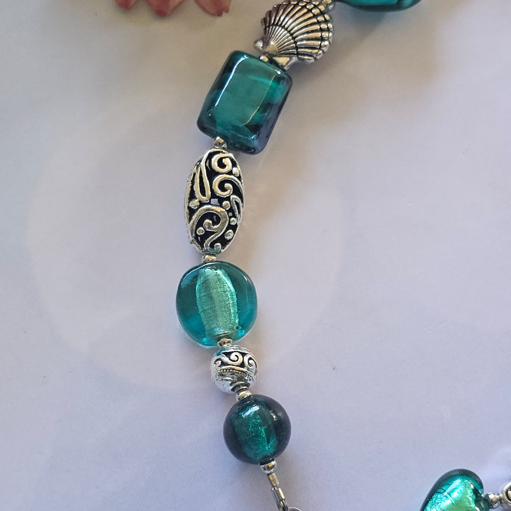 This lovely one-off necklace is made up of a mixture of beautiful glass beads in gorgeous shades of teal green, including four Murano glass beads of differing styles (the heart, the starburst square, the twisted column bead and the little silver foil heart), interspersed with silver base metal accent beads. Finished with a length of stainless steel chain allows the necklace to go straight over the head without the need for a clasp. The total length of the necklace is 70cm excluding the base metal tree charm (35 x 35mm) and 12mm twisted ring which together measure approximately 55mm in length.