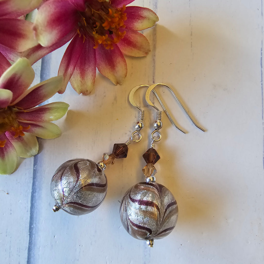 These earrings have pizazz. The feature beads are 14mm in diameter and have been made in the Fenicio technique where colours are drawn down creating a feathered effect in chocolate brown colour with avventurina in clear Murano glass encased with 24kt gold or white gold. Top-quality crystal bicones add some extra sparkle. 14kt gold-filled or .925 sterling silver beads, pins and ear-wires. The earrings measure approximately 45mm in length from the top of ear-wire to base of earring.