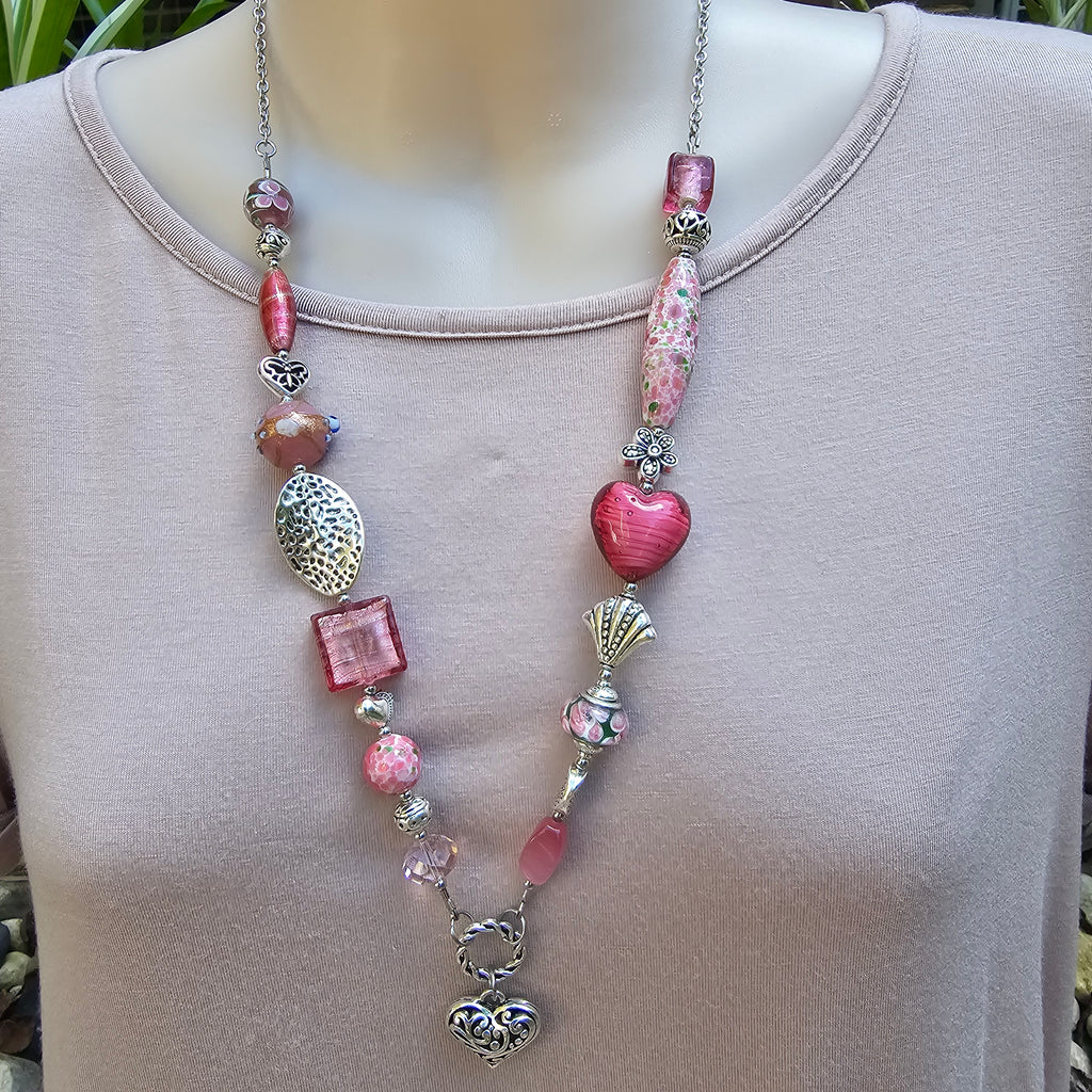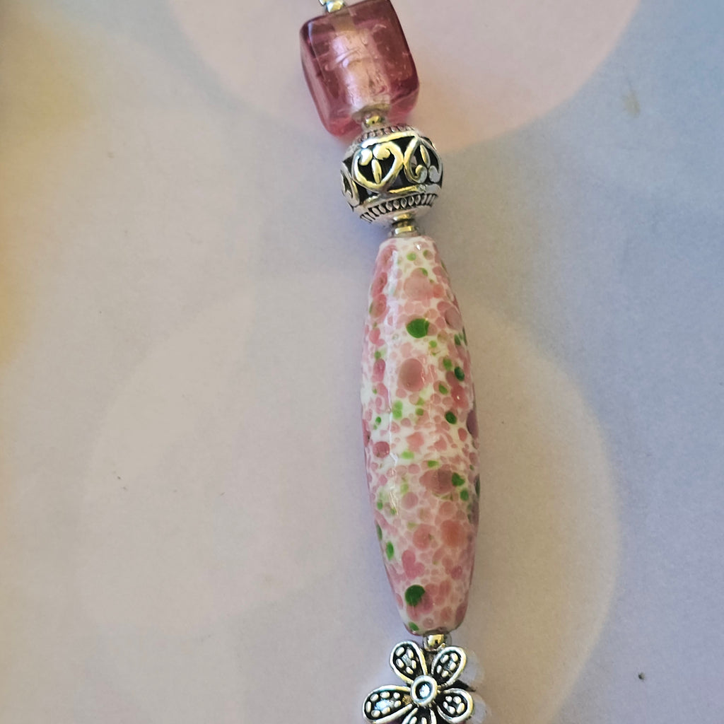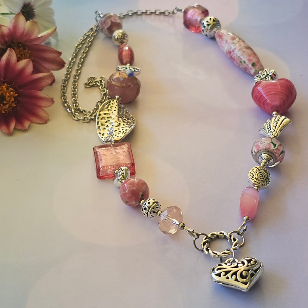 Pretty pink necklace featuring three absolutely gorgeous Murano glass beads (the heart, thin oval and flat square) as well as pretty faceted glass, silver foil glass beads and pretty pink and green lampwork glass beads. Interspersed between the feature beads is a selection of base metal silver beads. The necklace measures approximately 68cm in length excluding the heart charm which is 20 x 20mm and a 12mm ring, which together measure approximately 35mm in length. The necklace is finished with a length of stainless steel chain and is designed to go straight over the head.
