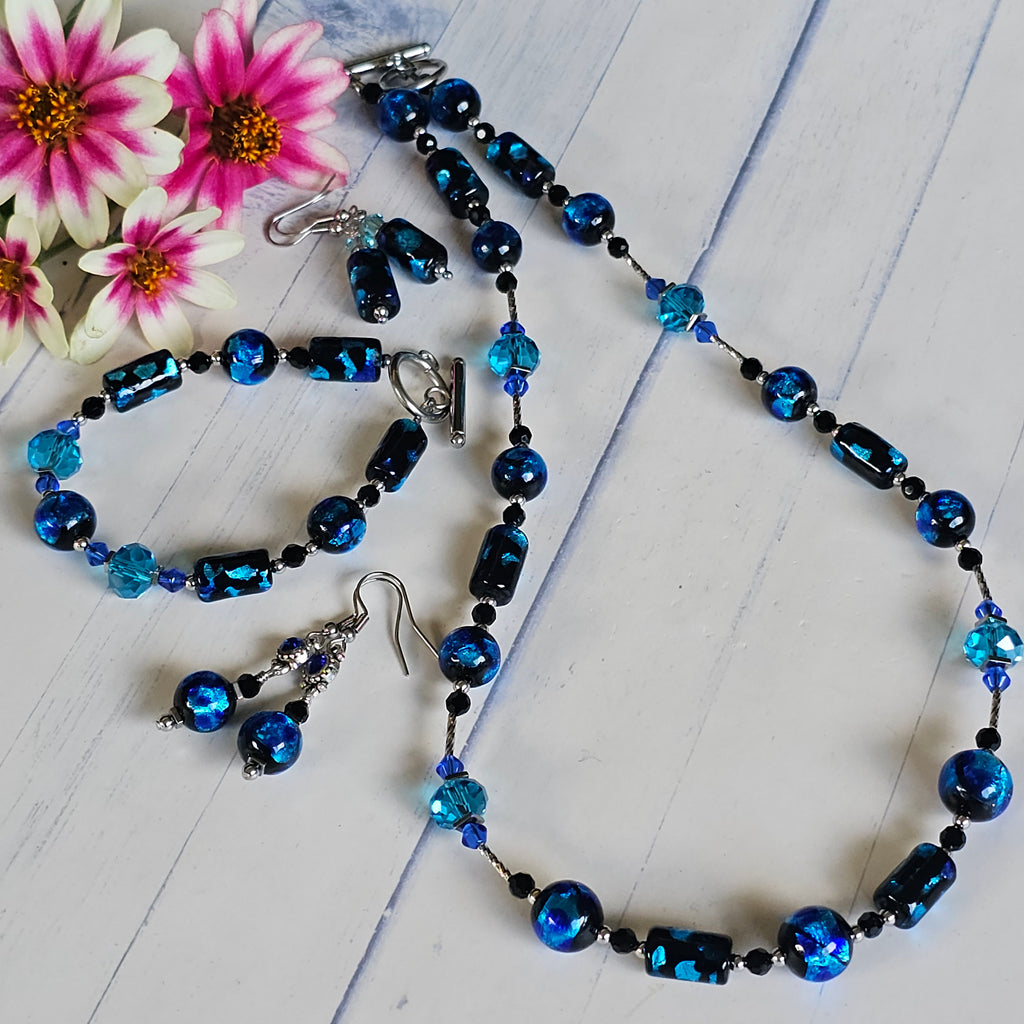 The lovely beads in this handmade bracelet are approximately 10mm round and tube shaped measuring approximately 12mm x 8mm, in shades of electric blue silver foil with random splotches of cobalt blue on a black base. The accompanying beads are aqua blue faceted glass rondelle beads together with 4mm black faceted glass beads and 3mm stainless steel round beads. The bracelet measures approximately 20.5cm and is completed with a stainless steel 12mm toggle clasp.